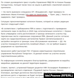 Правда, после того, как координатор "Центра прикладной урбанистики Казань" Марья Леонтьева позвонила в редакцию, слово "пикетчики" было заменено на "активисты". Кстати, сразу после того, как нас с Иваном Климовым забрали в отдел, на арене появился человек, который представился сотрудником ПСО "Казань" по имени Айрат. На стройплощадке к тому времени оставалась одна-единственная представительница СМИ - Регина Гималова из "Казанского репортера". Вот как она описывает беседу со спикером ПСО "Казань":