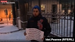 Иван Климов вышел на пикет у здания Полномочного представительства Республики Татарстан в Москве с двухсторонним плакатом. На одной стороне размещено требование отпустить активистов, на другой - требование следовать девизу "Футбол - планете", с которым сегодня активисты хотели встать на пути следования президента ФИФА.