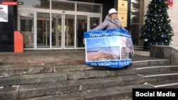 У здания Минэкологии стоит Гульнара Гилязова с плакатом "Татарстан - пилотный регион по засыпке Волги". Всех проходящих мимо она спрашивает о том, знают ли они, что в Татарстане засыпают Волгу. Трансляцию акции ведет в Facebook казанский активист Иван Климов.