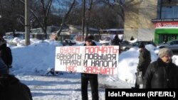 Гражданский активист Сергей Челноков пришел на митинг с плакатом с текстом: "Будем молчать, бандиты, повышая тарифы и налоги нас задушат".