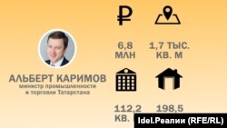 Второе место по уровню дохода занял министр промышленности и торговли Альберт Каримов с 6,8 млн рублей. В прошлом году, тогда еще новобранец в строю министров отчитался о 29,3 млн рублей. Недвижимость чиновника также не изменилась — он владеет землей (1,7 тысячи квадратных метров), домом (198,5 кв. м) и двумя квартирами (46,2 и 66 кв. м).