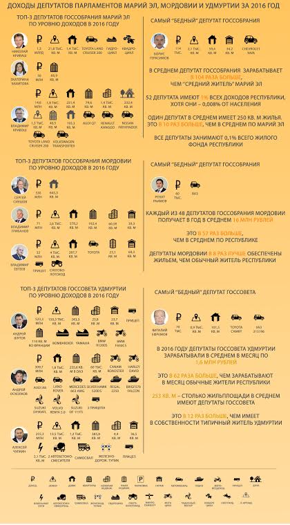 "Idel.Реалии" продолжают изучать декларации региональных парламентариев в Поволжье. Сегодня — Марий Эл, Мордовия и Удмуртия. Самый богатый депутат Марий Эл заработал 1,3 млрд рублей, а самый бедный — лишь 114 тысяч. Но все равно это больше, чем самый бедный депутат Мордовии — Ренат Раимов, задекларировавший лишь 60 тысяч рублей.