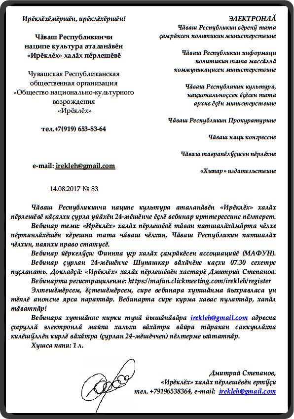 — Чиновники, как мы все знаем (на чувашском языке — "халăх тарçисем"), слуги народа, к ним мы и обращаемся. Официальные письма пишутся нами по ведомственной принадлежности для ответа по существу, для решения тех или иных вопросов, затронутых в них, а не для "сотрясения воздуха".
