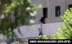 Полицейский помогает людям бежать из здания парламента Ирана во время террористического нападения 7 июня.