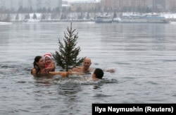 Любители зимнего плавания в Красноярске отмечают приближение нового, 2018 года погружением в Енисей. 23 декабря 2017 года.