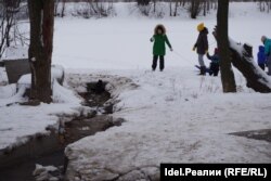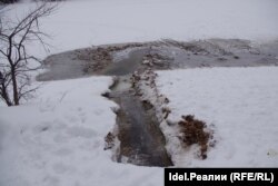 А уж вот это (показывает на след на льду залива — "Idel.Реалии") — совсем уже из рук вон выходящее! В воду, где находится водозабор, идет забор для очистки питьевой воды — извините за выражение, я уж русским языком скажу — говно слили вот сюда в реку!