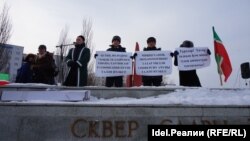 Участники митинга держали в руках плакаты "Путин, Володин! Ратифицируйте Европейскую хартию региональных языков", "Минниханов, Мухаметшин, требуем открыть татарский национальный университет", "Чиновники, перестаньте ущемлять татар и его язык", "Татары против политики ассимиляции", "Министр образования Васильева! Требуем сдачи ЕГЭ на татарском языке".