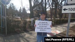 Автоблогер Алексей Лапшин проводит одиночный пикет у здания мэрии Чебоксар. Он требует призвать к ответу главу администрации города Алексея Ладыкова из-за плохих дорог в городе. Yеделю назад сити-менеджер города дал указание о срочном проведении ямочного ремонта на улицах города.