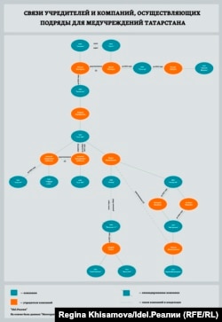 Фарида Израфилова владеет ООО "Развитие", выигравшим с мая 2017 года по настоящее время 17 контрактов в Татарстане на 39,6 млн рублей. У Марата Мухутдинова — ООО "Ренир", еще один подрядчик с 158 контрактами на 294,4 млн рублей. Есть у него еще и башкортостанское отделение компании — ООО "Ренир РБ". Он владеет им совместно с Альбертом Юмалиным, которому, в свою очередь, до августа 2016 года принадлежало еще и ООО "МК Дельта" — 14 контрактов на 41 млн рублей. Сейчас последняя принадлежит Валерию Латыпову, бывшему совладельцу "Ренир РБ" (до марта 2017 года). Их партнер по "Дельте" — Гюзель Мухутдинова, вероятно, жена Марата. Ей принадлежит ООО "ПраймМедСервис" — 86 подрядов на 286,6 млн рублей.
