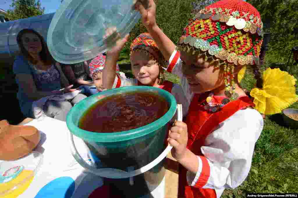 В первых рядах ковш получает старейшая жительница деревни Мария Андреевна Эльман. Она контролировала процесс пивоварения.