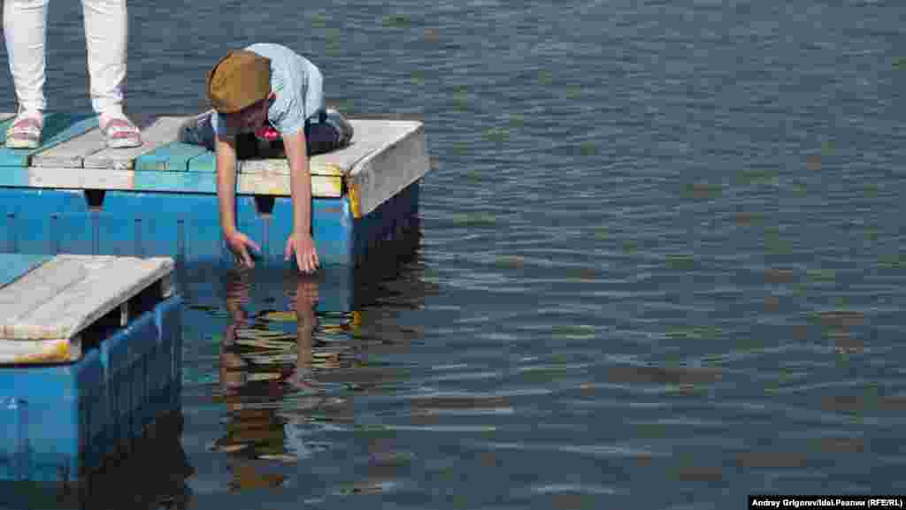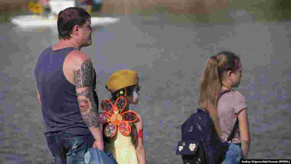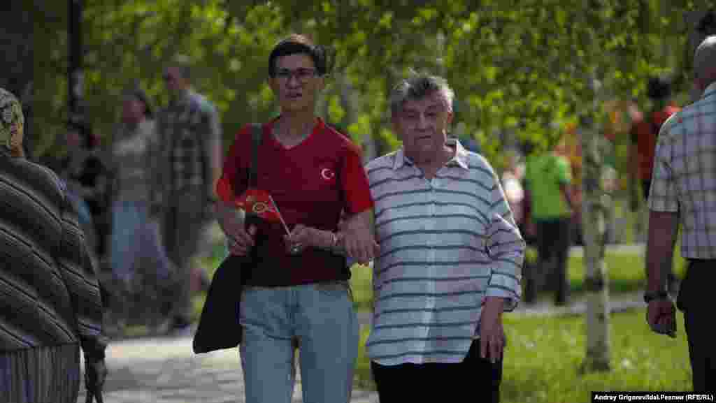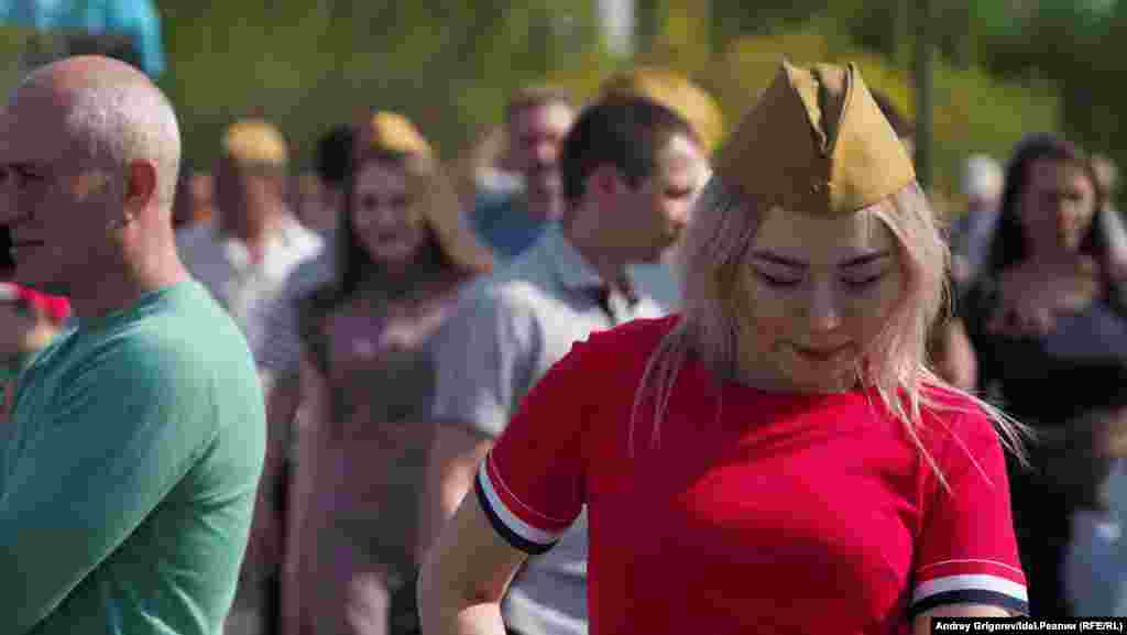 Георгиевские ленты и автомобильные наклейки, которыми уже давно никого не удивишь, оказались потеснены зёлеными пилотками с красными звёздами. Так что теперь георгиевские ленты, вокруг которых поломали столько копий, практически незаметны в пестрой толпе (возможно, потому, что они уже на каждом втором встречном). Тут, правда, тоже заметна некоторая эволюция — некоторые ленты украшены значками и цветочными бутонами — но куда больше бросаются в глаза именно красноармейские пилотки. Торговцы ими расположились у входа в казанский парк Победы. Недорого, 200 рублей — штука. Правда, на взрослые головы головных уборов у продавцов немного. Не то большие размеры уже расхватали, не то основная целевая аудитория — дети.