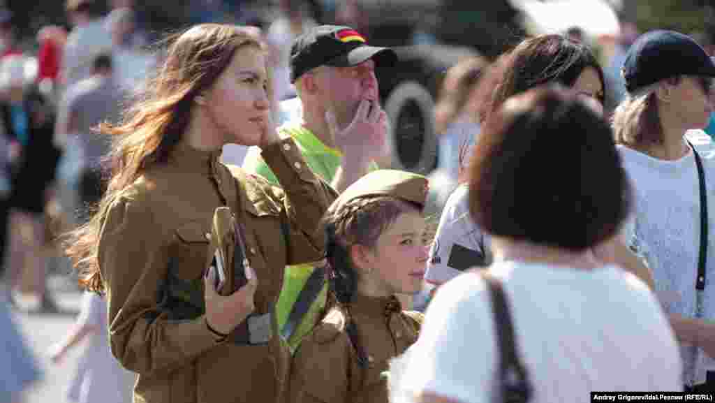 Пилотки и георгиевские ленты вступают порой в довольно занятный контраст с брендовыми футболками, на которых можно разглядеть надписи типа "Italy" или "British Made" — но такой контраст здесь никого не удивляет.