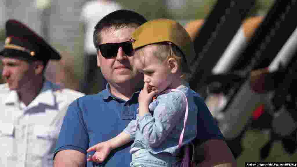 Георгиевские ленты и автомобильные наклейки, которыми уже давно никого не удивишь, оказались потеснены зёлеными пилотками с красными звёздами. Так что теперь георгиевские ленты, вокруг которых поломали столько копий, практически незаметны в пестрой толпе (возможно, потому, что они уже на каждом втором встречном). Тут, правда, тоже заметна некоторая эволюция — некоторые ленты украшены значками и цветочными бутонами — но куда больше бросаются в глаза именно красноармейские пилотки. Торговцы ими расположились у входа в казанский парк Победы. Недорого, 200 рублей — штука. Правда, на взрослые головы головных уборов у продавцов немного. Не то большие размеры уже расхватали, не то основная целевая аудитория — дети.