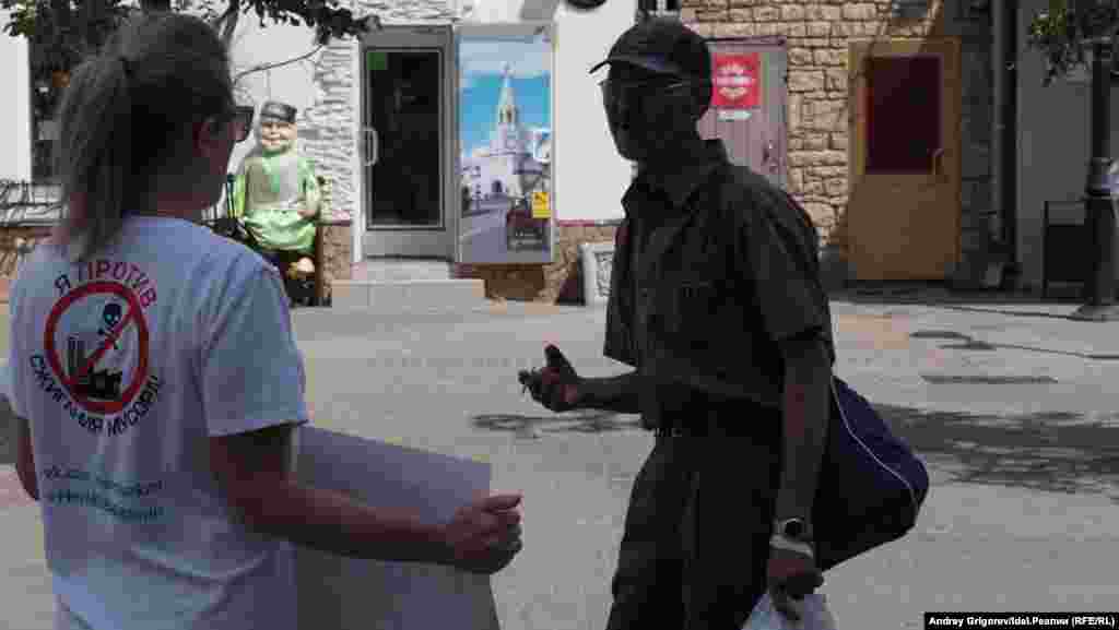 К этому времени пикетчиками уже заинтересовалась полиция. Один из стражей порядка старательно переписал данные пикетчиков и лозунги с их плакатов себе в блокнот. Но в отличие от Москвы, где в День независимости России были задержаны более 400 протестующих, общение казанских активистов с полицией к столь драматическим последствиям не привело.