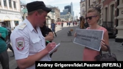 Пара полицейских — мужчина и женщина — подходят к пикетчикам спустя сорок минут после начала. За это время протестующие успели сменить друг друга уже не по разу.