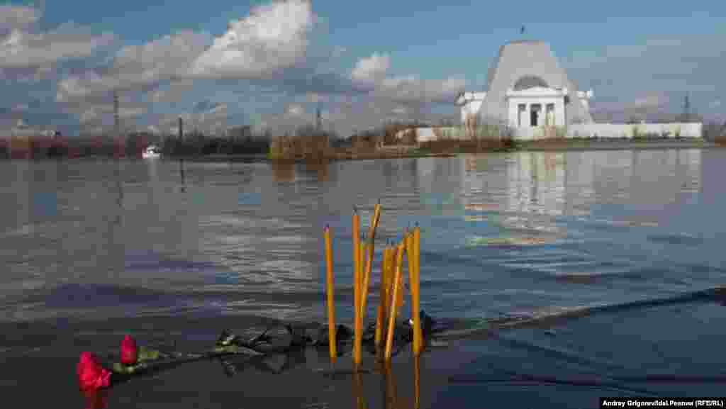 После окончания молитвы небольшая группа верующих во главе с председателем Общества русской культуры РТ Михаилом Щеглов добралась до храма-памятника, на катере, предоставленном МЧС.