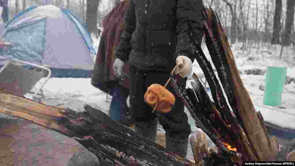 Люди находятся в лагере круглосуточно. К ночи с 3 на 4 декабря, например, там, как сообщила экоактивистка Вера Керпель, собралось около двух десятков человек.