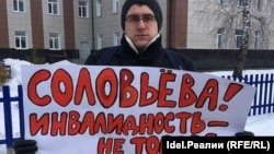Ульяновский правозащитник Дмитрий Старчиков сегодня вышел с одиночным пикетом к зданию Медико-социальной экспертизы (МСЭ) по Ульяновской области. Надпись на плакате Старчикова была обращена к руководителю бюро МСЭ Наталье Соловьевой: "Соловьева! Инвалидность — не товар! Диабетики — не нажива!".