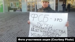 Сегодня, 21 февраля, в Ульяновске на улице Гончарова рядом с ЦУМом прошла серия одиночных пикетов в поддержку осужденных по пензенскому делу "Сети". Гражданский активист Алексей Нуруллин вышел с плакатом "ФСБ — это пытки, издевательства. 18 лет за разговоры, страйкбол. Убивают Россию. 1917 год":