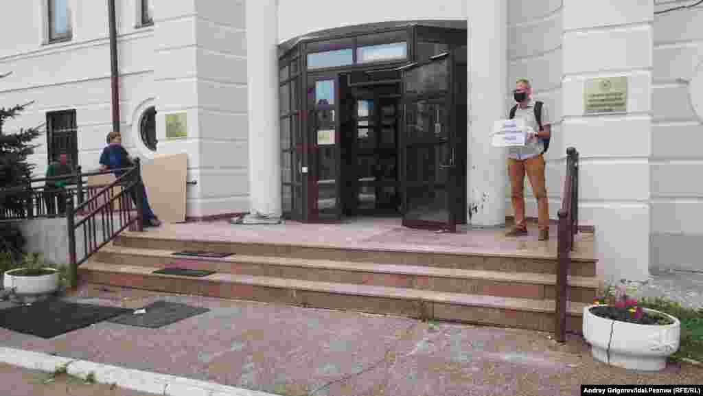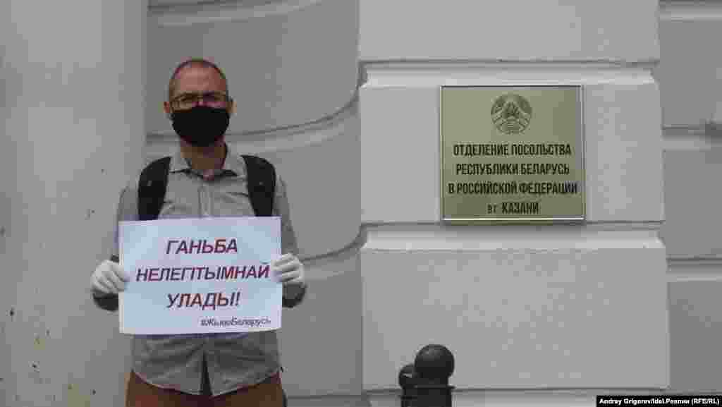 Почти час простоял в одиночном пикете с плакатом "Ганьба нелегітымнай улады!" ("Позор нелегитимной власти!") у отделения посольства Республика Беларусь в Казани активист и социолог Искандер Ясавеев. Отделение расположено в одном дворе с республиканскими структурами, крыльцо — под прицелом нескольких камер, но за целый час к Искандеру так ни разу и не вышел ни один полицейский, который заинтересовался бы надписью на плакате и доложил «наверх» о случившемся.