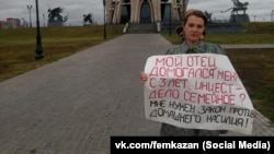 Девушка была одета в полудетское платье, в руках она держала плакат с надписью "Мой отец домогался меня с 3 лет. Инцест — дело семейное? Мне нужен закон против домашнего насилия", пишет сообщество группы "ФемКызлар" в соцсетях.