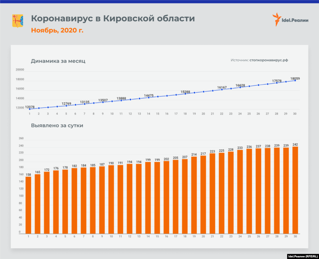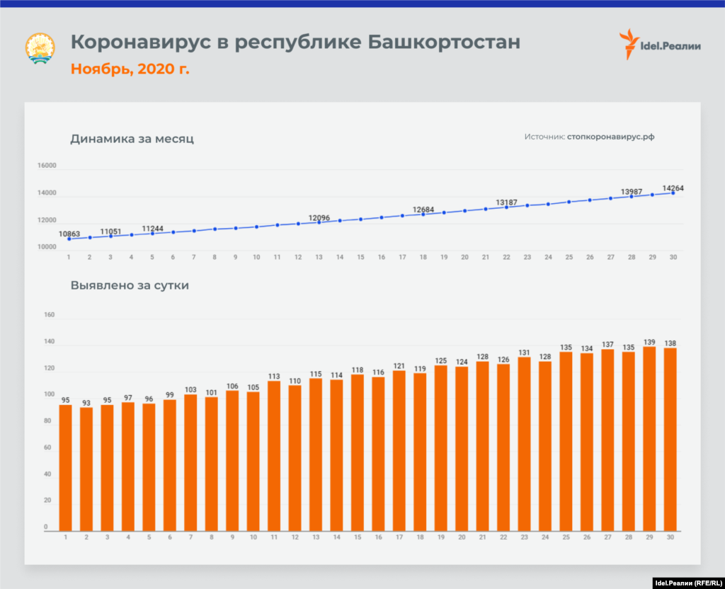 Если в начале месяца в Татарстане ежедневно выявлялось 45 случаев заражения коронавирусной инфекцией, то к концу ноября эта цифра почти удвоилась — до 84-х. В процентном соотношении это наибольший рост среди всех регионов Приволжского федерального округа — наряду с Чувашией и Пермским краем. А вот в Оренбургской и Пензенской областях на протяжении всего месяца цифры практически идентичные: ежедневно выявлялось чуть ли не одинакое количество случаев инфицирования.