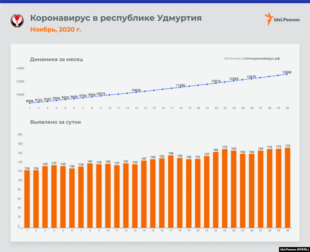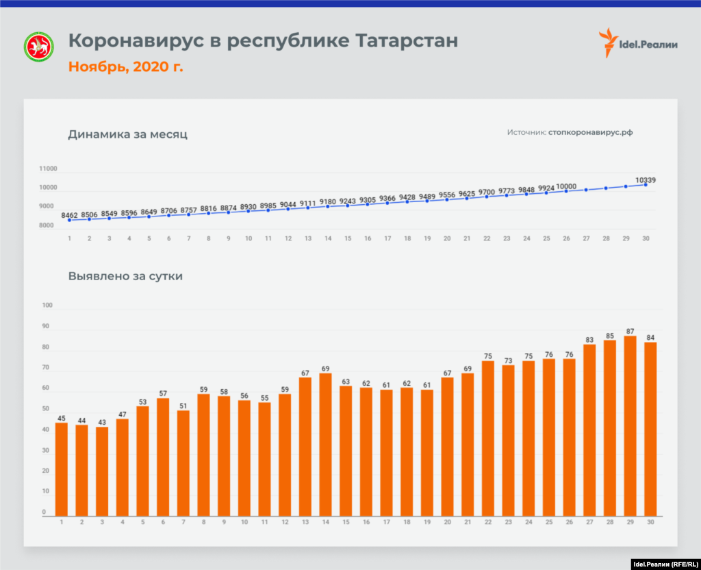 Если в начале месяца в Татарстане ежедневно выявлялось 45 случаев заражения коронавирусной инфекцией, то к концу ноября эта цифра почти удвоилась — до 84-х. В процентном соотношении это наибольший рост среди всех регионов Приволжского федерального округа — наряду с Чувашией и Пермским краем. А вот в Оренбургской и Пензенской областях на протяжении всего месяца цифры практически идентичные: ежедневно выявлялось чуть ли не одинакое количество случаев инфицирования.