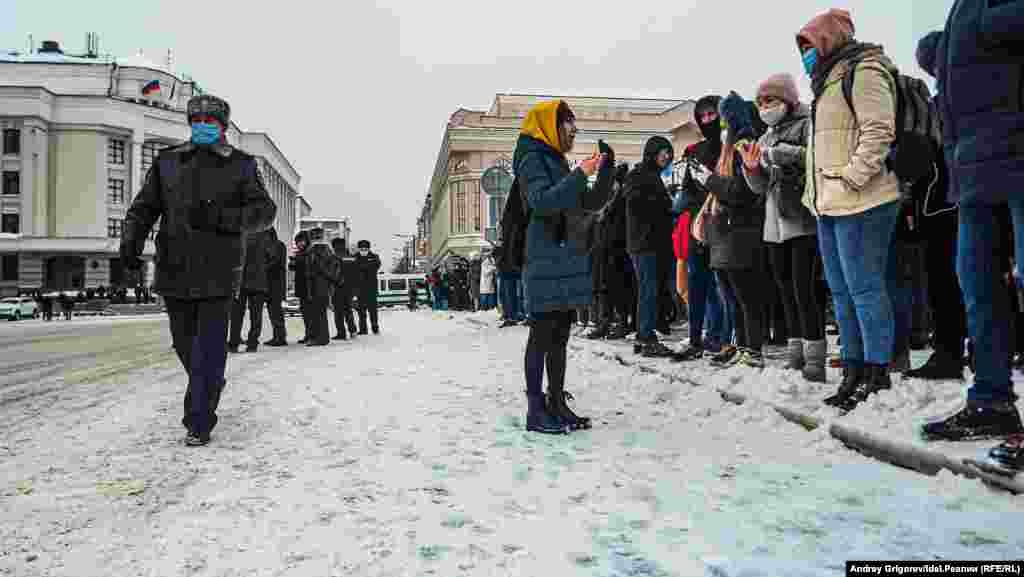 Изначально участники протеста в Казани планировали пройти по пешеходной улице Баумана от часов к кремлю — но это удалось далеко не всем. В два дня, 23 января, площадь с часами заняли полиция с росгвардией, а саму Баумана — перекрыли. Стихийно родилось предложение — идти на площадь Свободы, к Кабмину РТ. Такое отступление от планов, судя по всему, оказалось неожиданным для силовиков. Протестующие заняли площадь напротив дома правительства раньше, чем туда успели стянуть полицию с росгвардией.