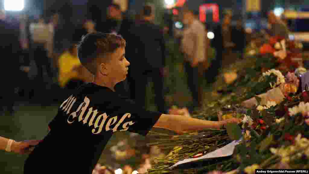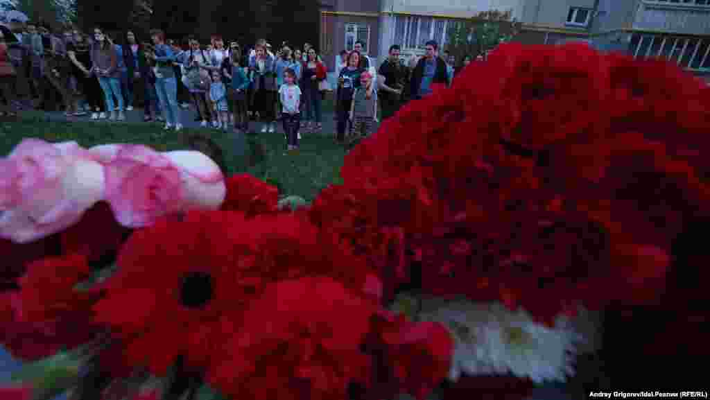 Казанцы до поздней ночи несли цветы, мягкие игрушки и свечи к школе, которая 11 мая подверглась атаке вооруженного ружьём 19-летнего парня. Уже в восемь вечера импровизированный мемориал утопал в цветах и плюшевых мишках. Он был организован на газоне наискосок от школы. К самому учебному заведению многочисленных казанцев не подпускала полиция.
