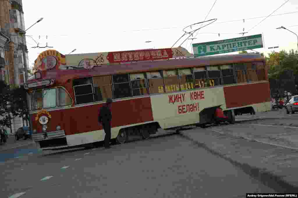 Трамвай-трактир "Пятёрочка" сошёл с рельс и перекрыл проезжую часть на улице Декабристов у остановки Гагарина. Июнь 2007 года.