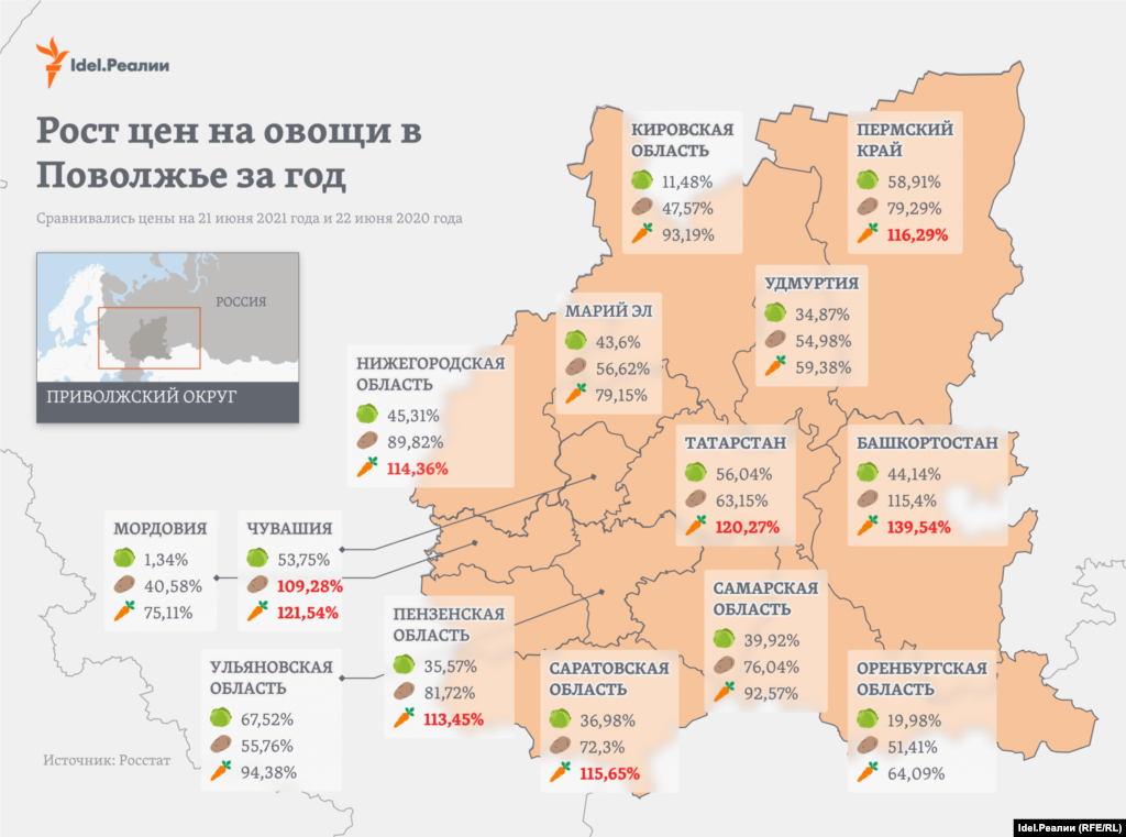Такого роста цен не было в Поволжье год назад. А некоторые позиции даже подешевели по сравнению с 2019 годом. Возьмем в пример также Татарстан. Морковь летом 2019 года стоила 43,04 рубля, а через год, как мы писали выше, она стала стоить 33,06 рубля.