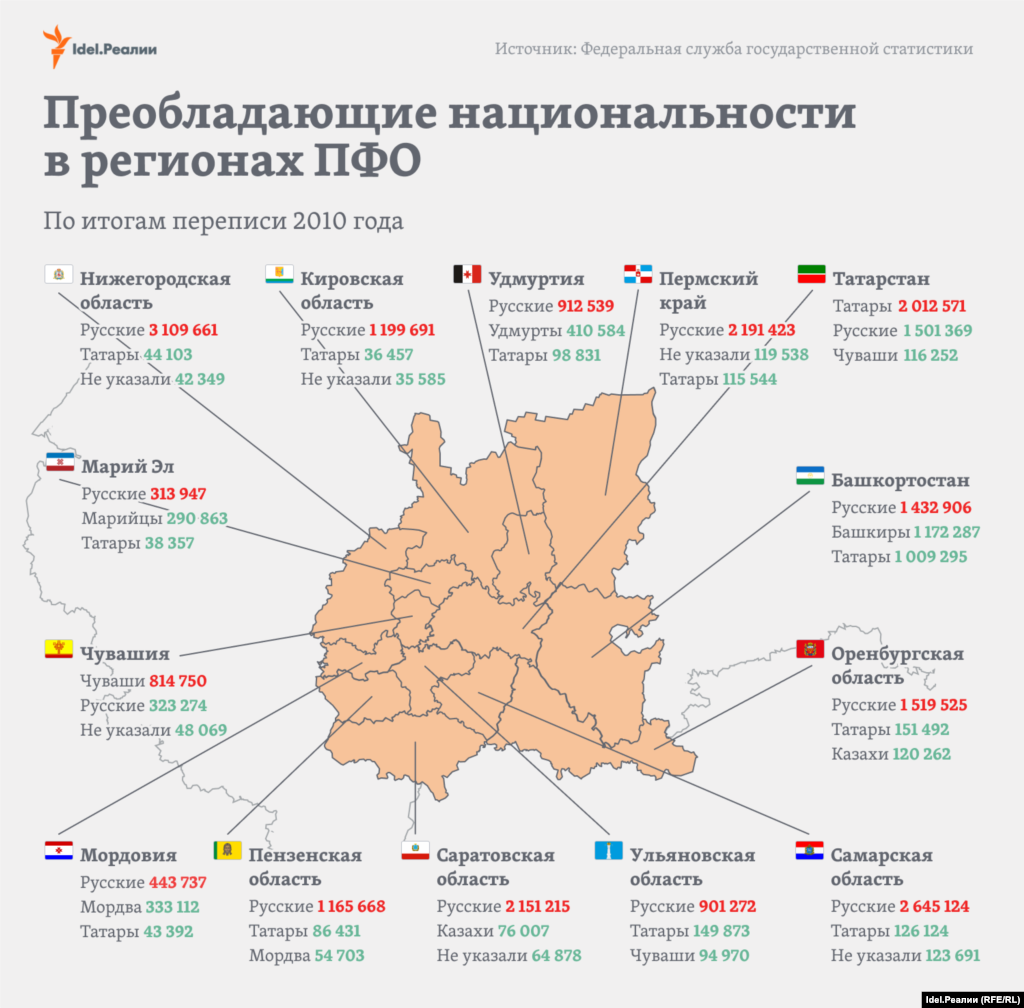 "Idel.Реалии" решили вспомнить результаты прошлой переписи. На этот раз посмотрим, как распределялись преобладающие национальности в Поволжье в 2010 году.