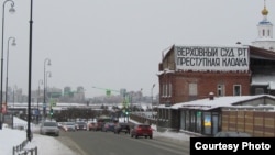 Марс Хайруллин, живущий в доме под Казанским кремлём, заявил о себе очередным баннером. "Верховный суд РТ преступная клоака", — гласит надпись на новой растяжке, которой он украсил чердачную стену дома вечером 16 января.