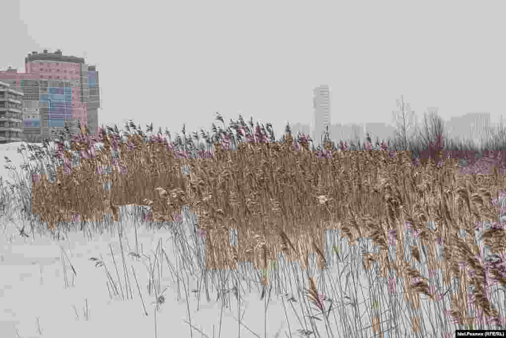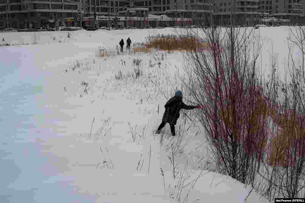 Эта намытая около десяти лет на Казанке назад территория, расположенная вдоль улицы Сибгата Хакима, давно уже превратилась для казанцев, живущих в многоэтажках поблизости, в своего рода парк дикой природы. Летом на песчаных барханах, которые сейчас скрыты снегом, загорают, осенью собирают облепиху с многочисленных кустов и кормят уток, плавающих в заливе, зимой катаются на лыжах и выгуливают собак.