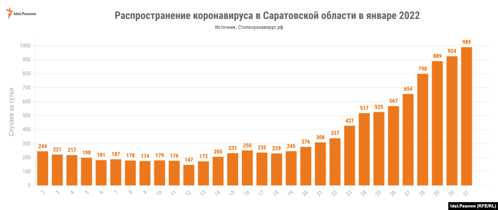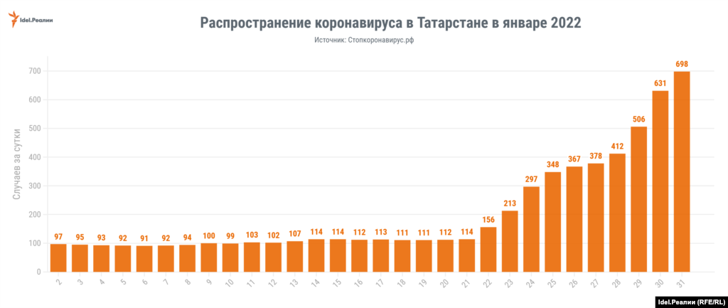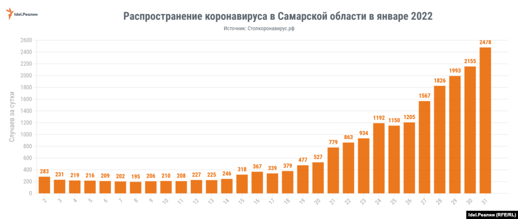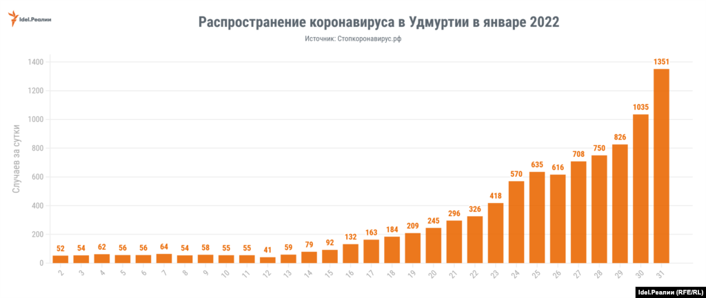 Самый большой рост суточных заражений за месяц показала Удмуртия. Если в начале января было 52 случая за сутки, в конце января — уже 1351. Рост в 26 раз. Следом идут Чувашия (рост в 13,2 раза) и Оренбургская область (в 10,2 раза).
