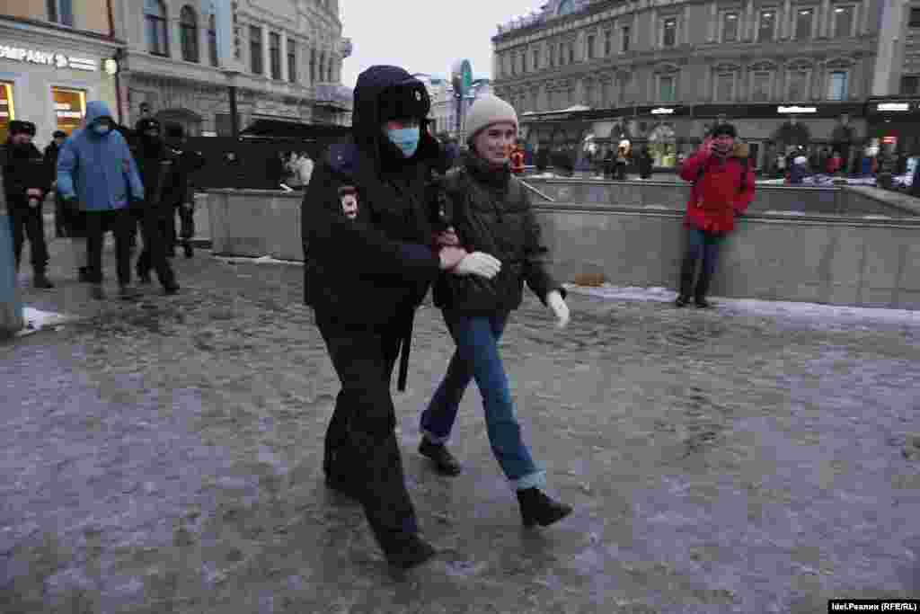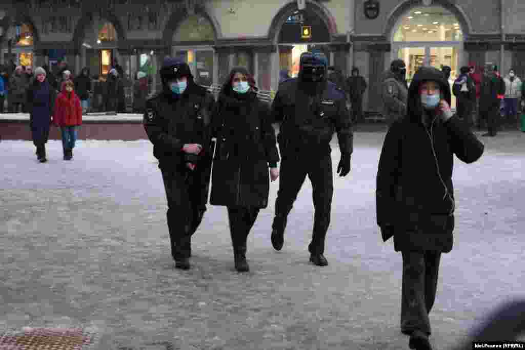 Перед погрузкой в автозак активист Марк Серов успел выкрикнуть "Да здравствует свобода". Следом задержали еще нескольких протестующих. Одна из девушек сказала полицейским, что "Путин — военный преступник, у него будет трибунал в Гааге". Сотрудники в свою очередь молча грузили ее в автозак.
