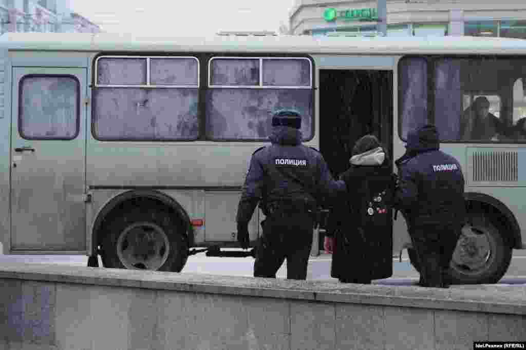 К ним присоединился казанский активист Андрей Бояршинов, который выкрикнул "Путин — военный преступник" и развернул плакат "No war". Сразу после этого замначальник казанской полиции Сергей Чанкин отдал приказ задерживать протестующих. Четырех участников акции поволокли в микроавтобус, припаркованный на улице Пушкина.