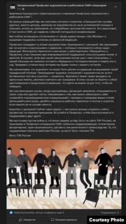 В заявлении сказано, что профсоюз получает из разных уфимских редакций СМИ — в том числе и независимых — "сигналы о попытках, в большинстве случаев удачных, ввести цензуру, давлении на журналистов из-за их антивоенной позиции и санкциях — вплоть до увольнения — за "неудобные" для властей новости".