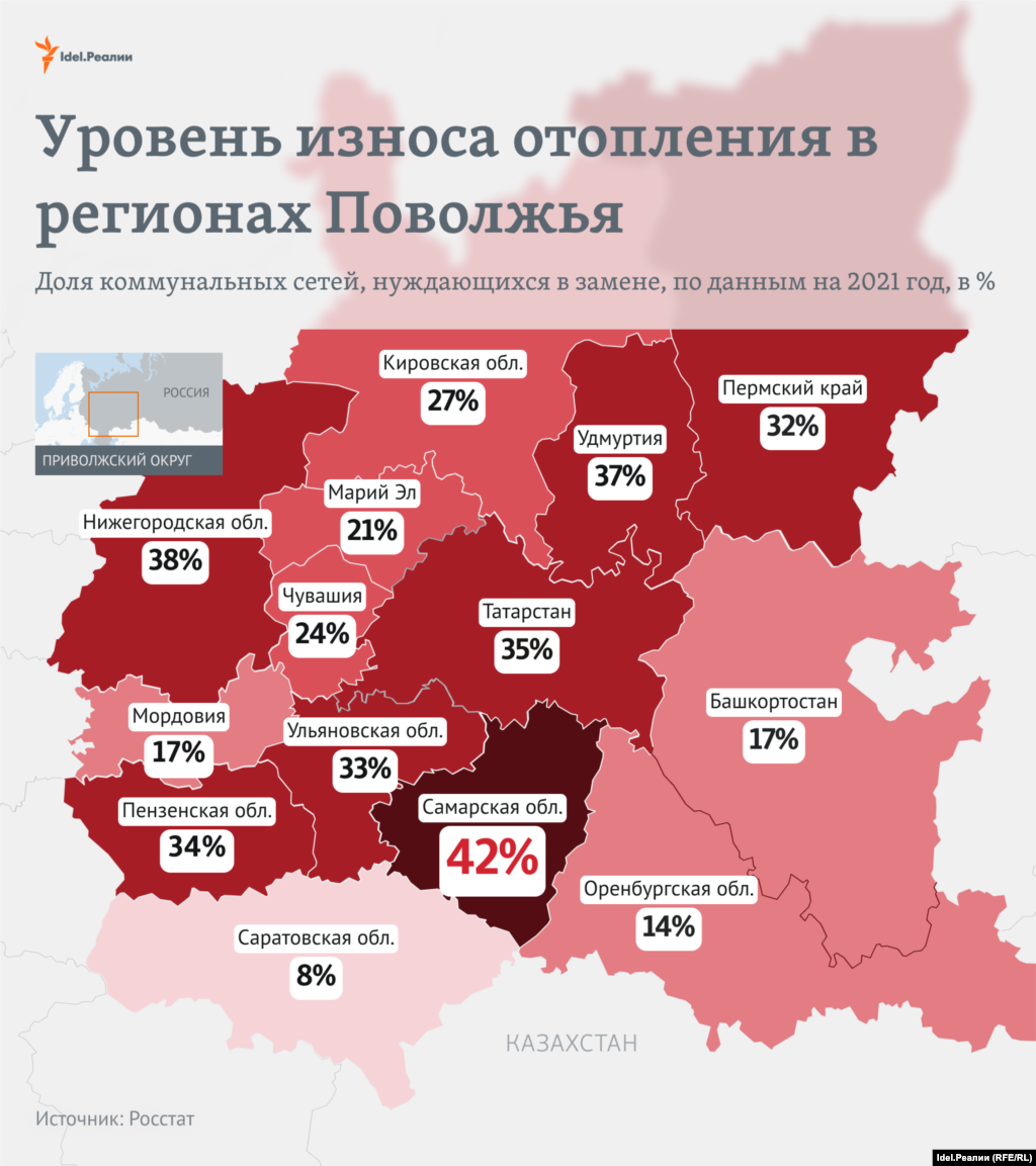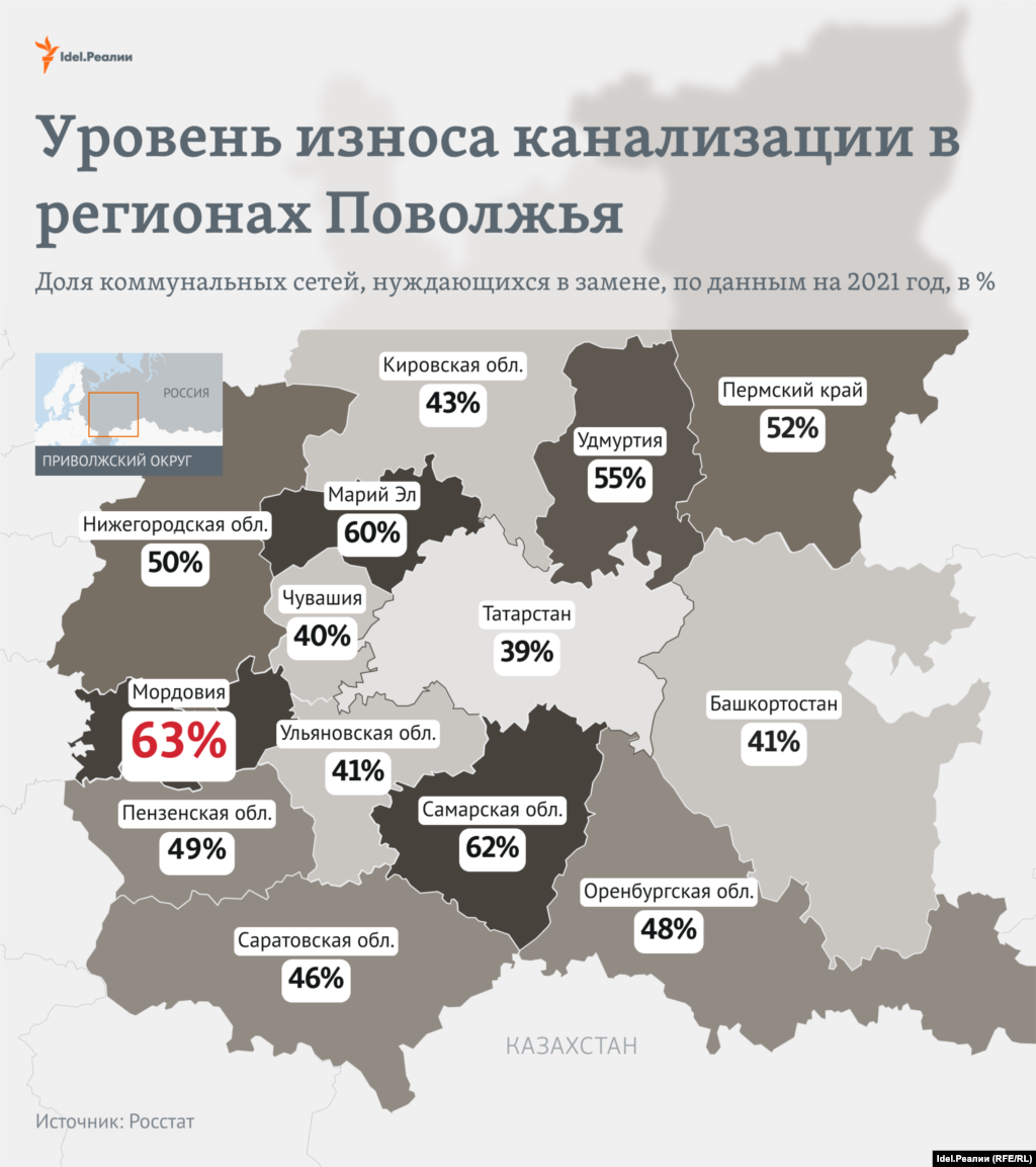 В некоторых регионах системы ЖКХ изношены, судя по официальной статистике, больше чем наполовину. В Самарской области, например, нужно заменить 53% водопроводных и 42% тепловых сетей. По этим показателям регион оказался на первом месте. По износу канализационных сетей на первом месте — Мордовия (63% сетей нуждается в замене).