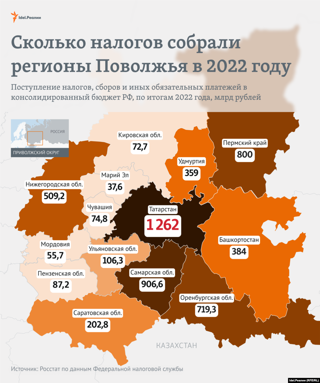 Татарстан в 2022 году отправил в федеральный центр больше налогов, чем Марий Эл, Чувашия, Мордовия, Удмуртия, Саратовская, Пензенская, Кировская области вместе взятые