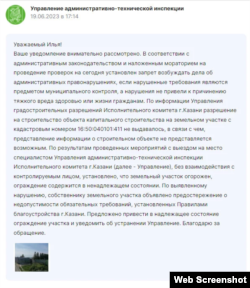 Так, например, поступило управление административно-технической инспекции исполкома Казани, комментируя жалобу одного из казанцев в системе "Народный контроль".