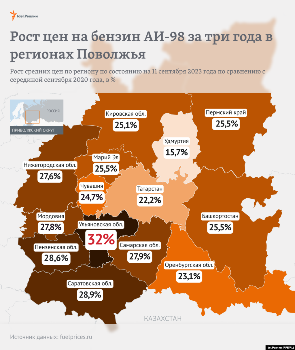Бензин марки АИ-95 за три года сильнее всего вырос в Марий Эл — на 22,2%, в Самарской (+20,4%) и Саратовской областях (+20,2%).