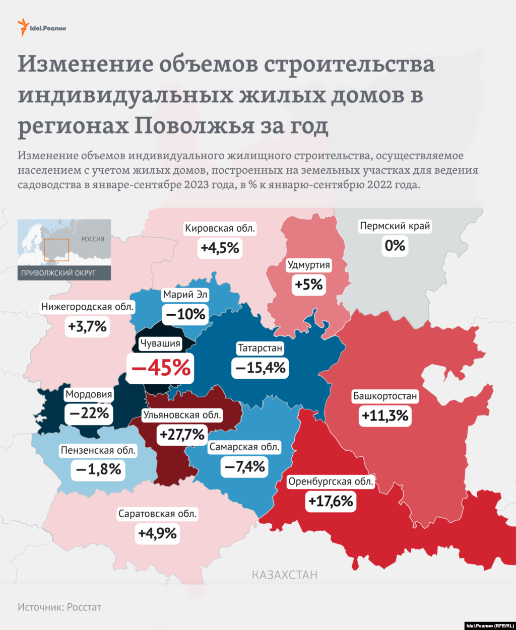 В Чувашии объем индивидуального жилищного строительства в январе-сентябре 2023 года упал на 45% по сравнению с январем-сентябрем 2022 года. По падению этого показателя республика заняла первое место в Поволжье. На 22% за год упало строительство индивидуального жилья в Мордовии, на 15,4% — в Татарстане.