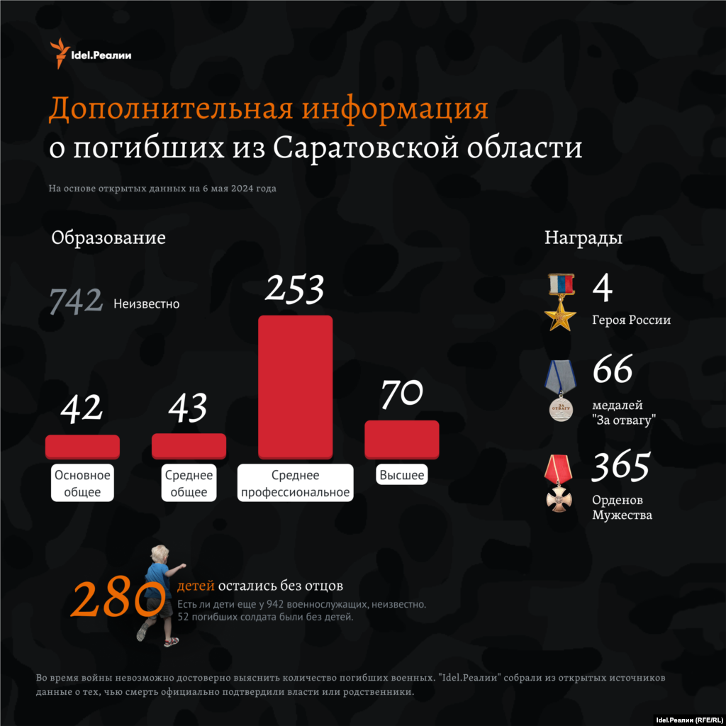 Как минимум 379 человек были в возрасте до 35 лет. Это 33% от общего количества известных погибших — выходцев из Саратовской области.