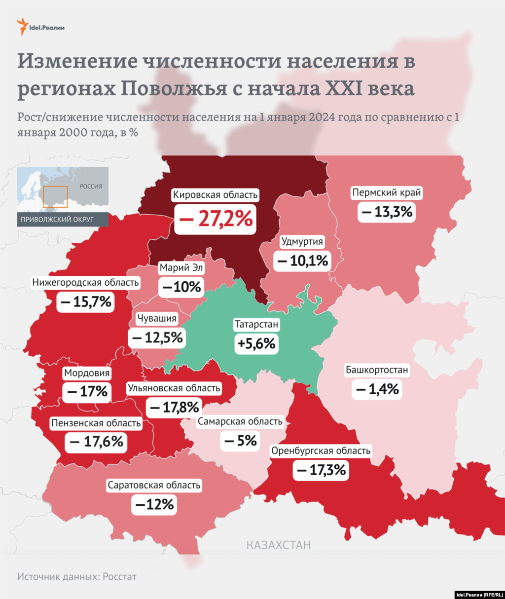 С начала века (2000 года) численность населения в регионах Поволжья преимущественно снизилась. На первом месте по этому показателю оказалась Кировская область — почти за четверть века численность населения там убавилась на 27,2%. Следом по снижению с большим отрывом идут Ульяновская (— 17,8%), Пензенская (— 17,6%) и Оренбургская области (— 17,3%).