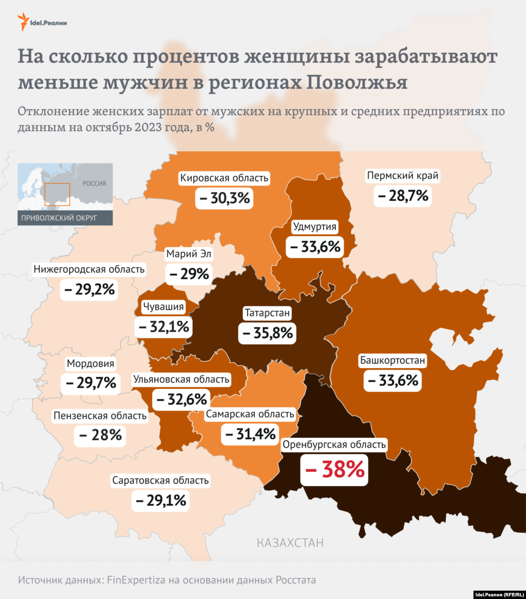 По этому показателю регион занял первое место в Поволжье. Также большая разница между мужскими и женскими зарплатами фиксировалась в Татарстане (женские зарплаты были ниже на 35,8%), в Удмуртии и Башкортостане (разница в 33,6%).