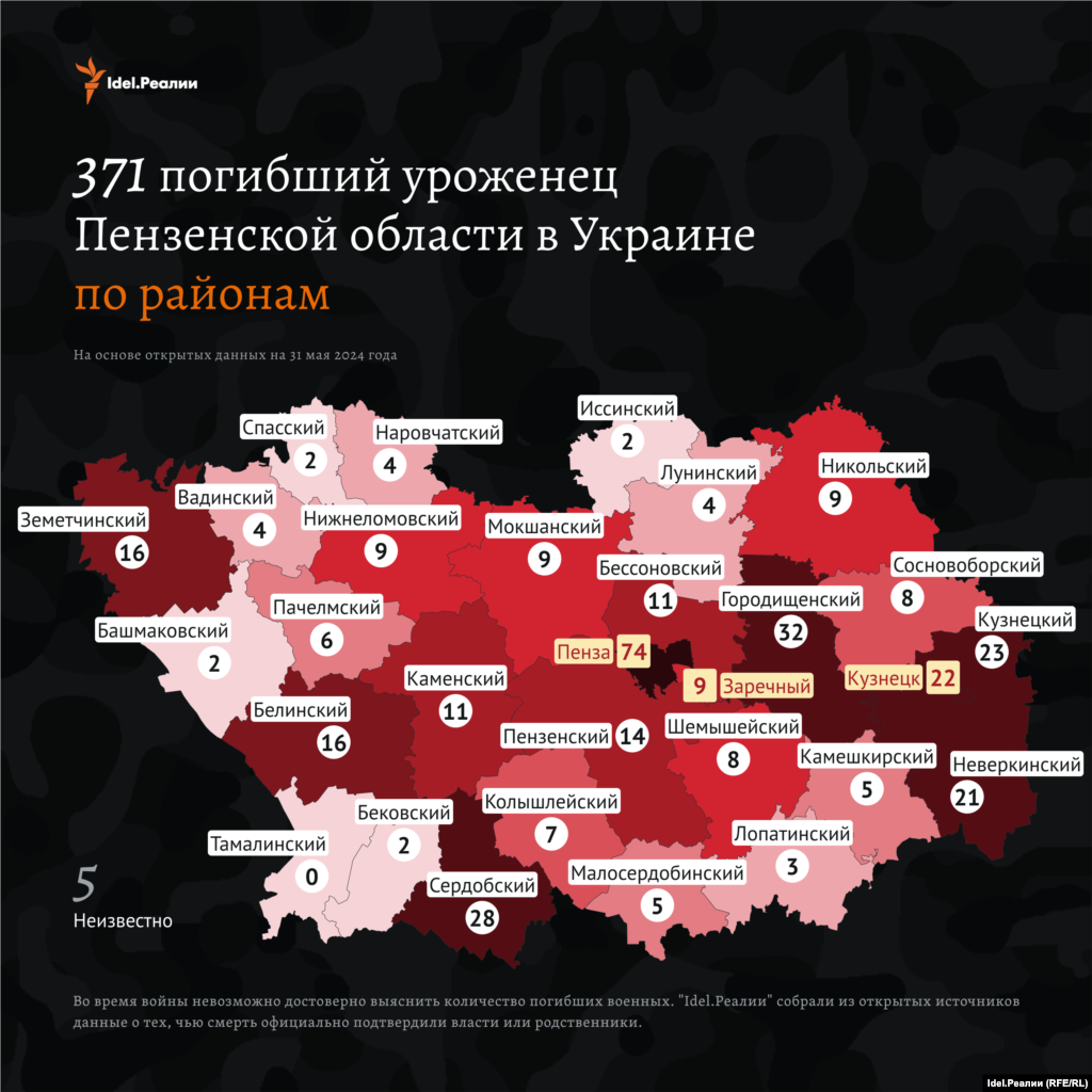 Количество погибших в действительности больше, мы руководствуемся лишь данными из открытых источников. По подсчетам (https://smarturl.click/v8pR) "Idel.Реалии", с начала войны погибли 14 622 уроженца и жителя Поволжья.