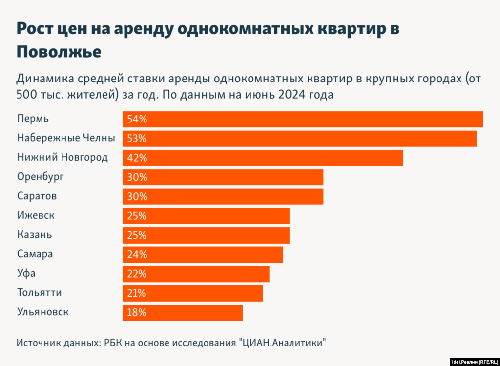 За год средняя ставка аренды однокомнатных квартир в Перми выросла на 54% (до 24,7 тысячи рублей), в Набережных Челнах — на 53% (до 20,4 тысячи рублей в месяц), говорится в исследовании экспертов "ЦИАН.Аналитики", которое опубликовал РБК.