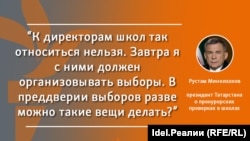— В политике есть определенное место для торга. Во-первых, наш президент Рустам Минниханов не сказал, что учителя создают [Путину] 90% — он сказал, что именно директора школ организовывают выборы, поскольку избирательные участки находятся в основном в школах. Вы когда-нибудь видели, чтобы в России выбирали кого-либо с результатом 90%? Так не бывает у нас! Тем не менее, каждому хочется больше голосов, чтобы быть более легитимным. Но если проходят честные выборы, там совсем другие результаты. Были у нас уже честные выборы на нескольких избирательных участках, где оппозиция фактически получала большинство. Поэтому сегодня, я думаю, напомнить об этом было не лишним.
