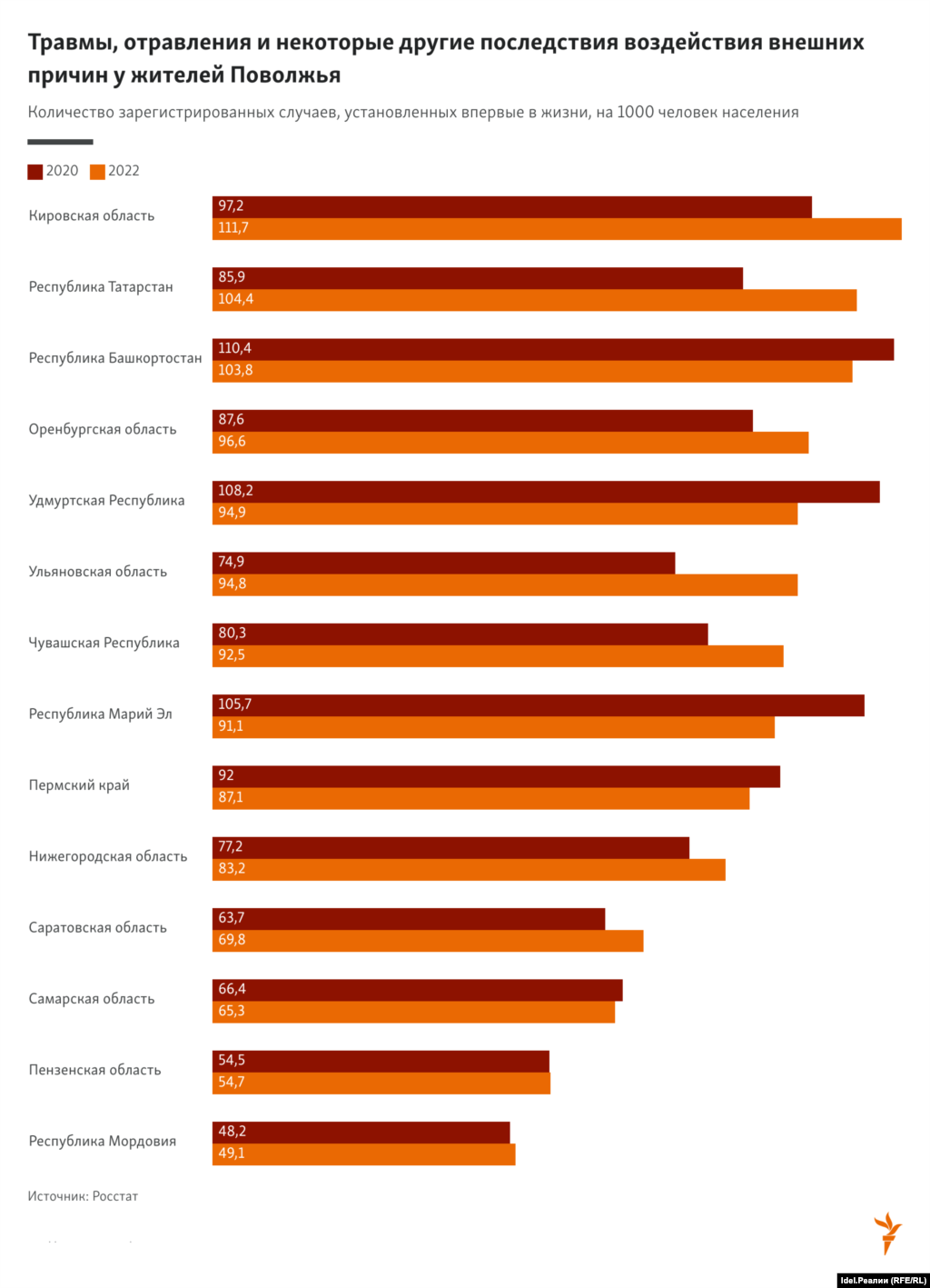 По получению травм, отравлений и некоторых других последствий воздействия внешних причин в 2022 году лидером оказалась Кировская область — 111,7 случаев на 1 000 населения, тогда как в 2020 году таких случаев было 97,2 на 1000. Затем идут Татарстан (104,4 в 2022-м против 85,9 в 2020 году) и Башкортостан (103,8 в 2022-м против 110,4 в 2020-м).